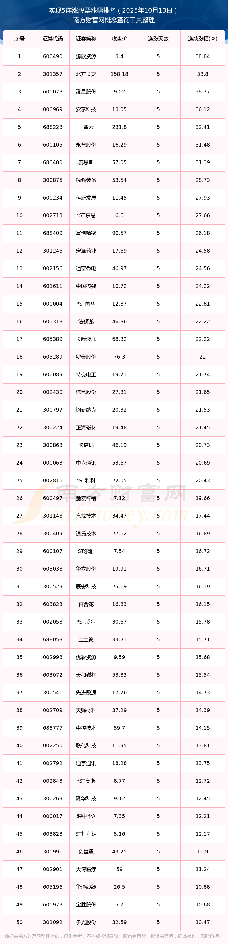 2025年10月13日實(shí)現(xiàn)5連漲股票漲幅排名