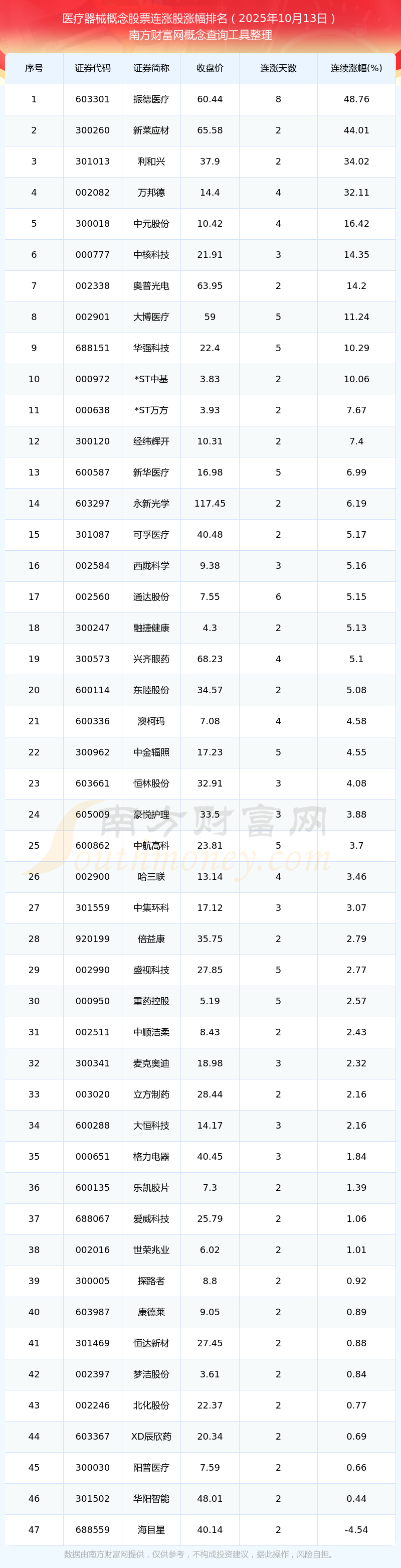 2025年10月13日醫(yī)療器械概念股票連漲股漲幅排名