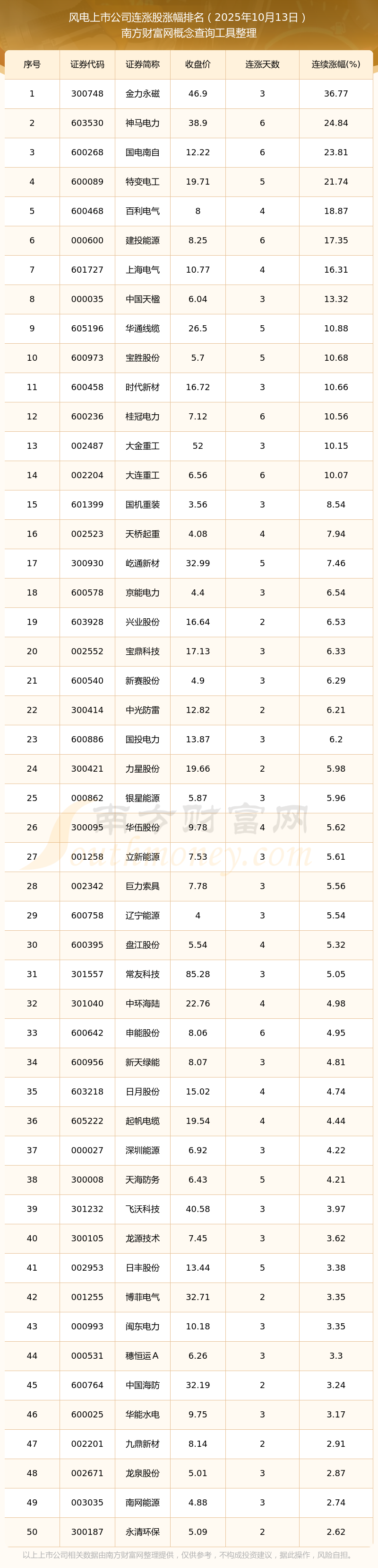 根據(jù)南方財富網(wǎng)概念查詢工具數(shù)據(jù)統(tǒng)計,截止2025年10月13日收盤,風電上市公司共有59只個股實現(xiàn)連漲。其中連續(xù)漲幅較大的個股有金力永磁、神馬電力、國電南自等,連續(xù)漲幅分別為36.77%、24.84%、23.81%。
