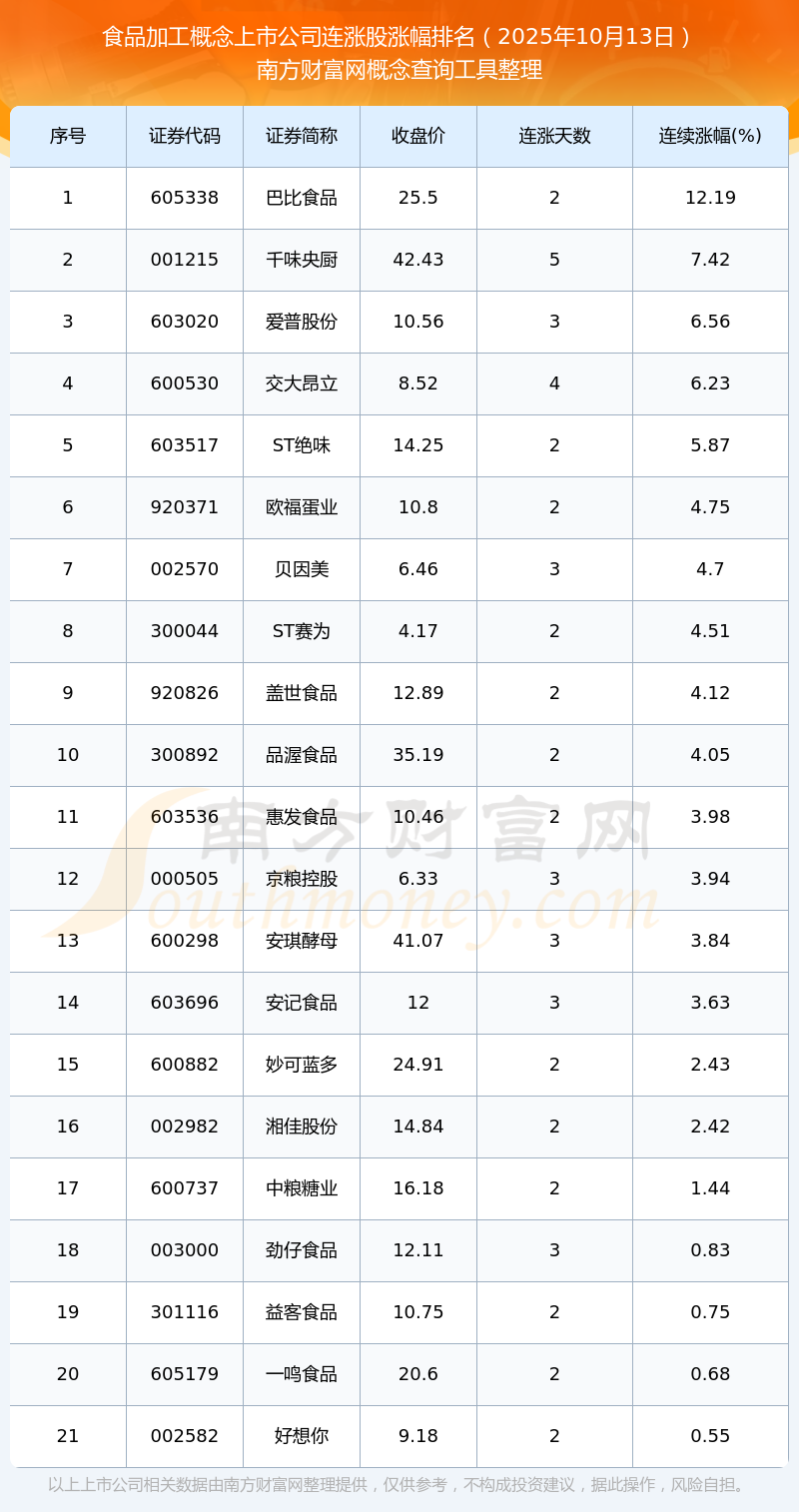 2025年10月13日食品加工概念上市公司連漲股漲幅排名