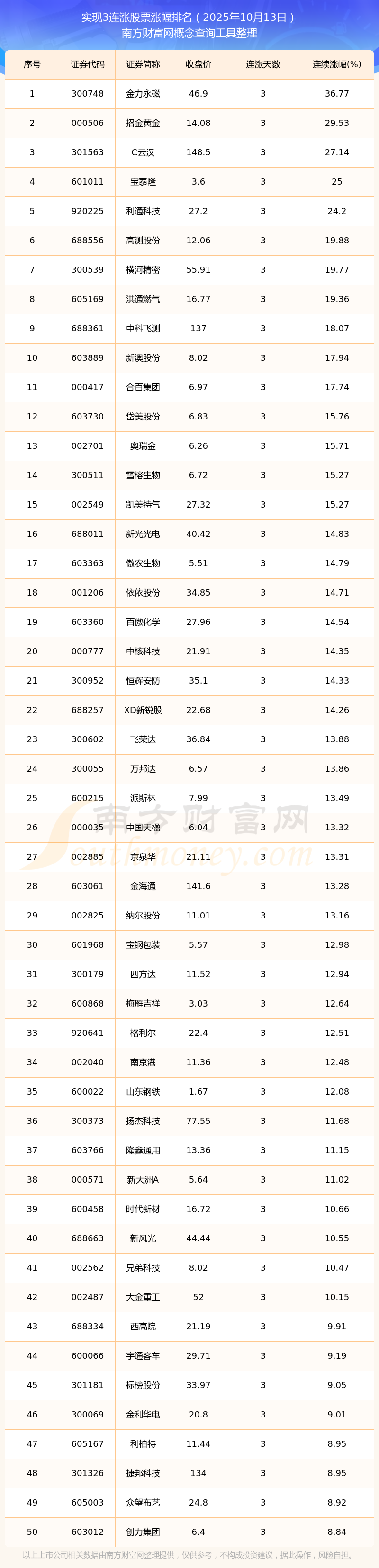 2025年10月13日實(shí)現(xiàn)3連漲股票漲幅排名