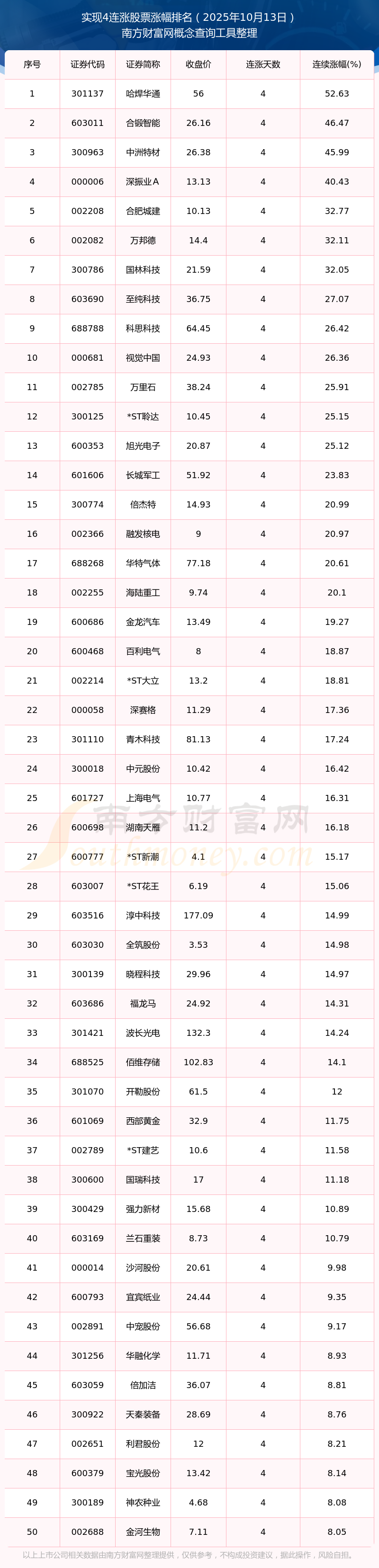 2025年10月13日實現(xiàn)4連漲股票漲幅排名