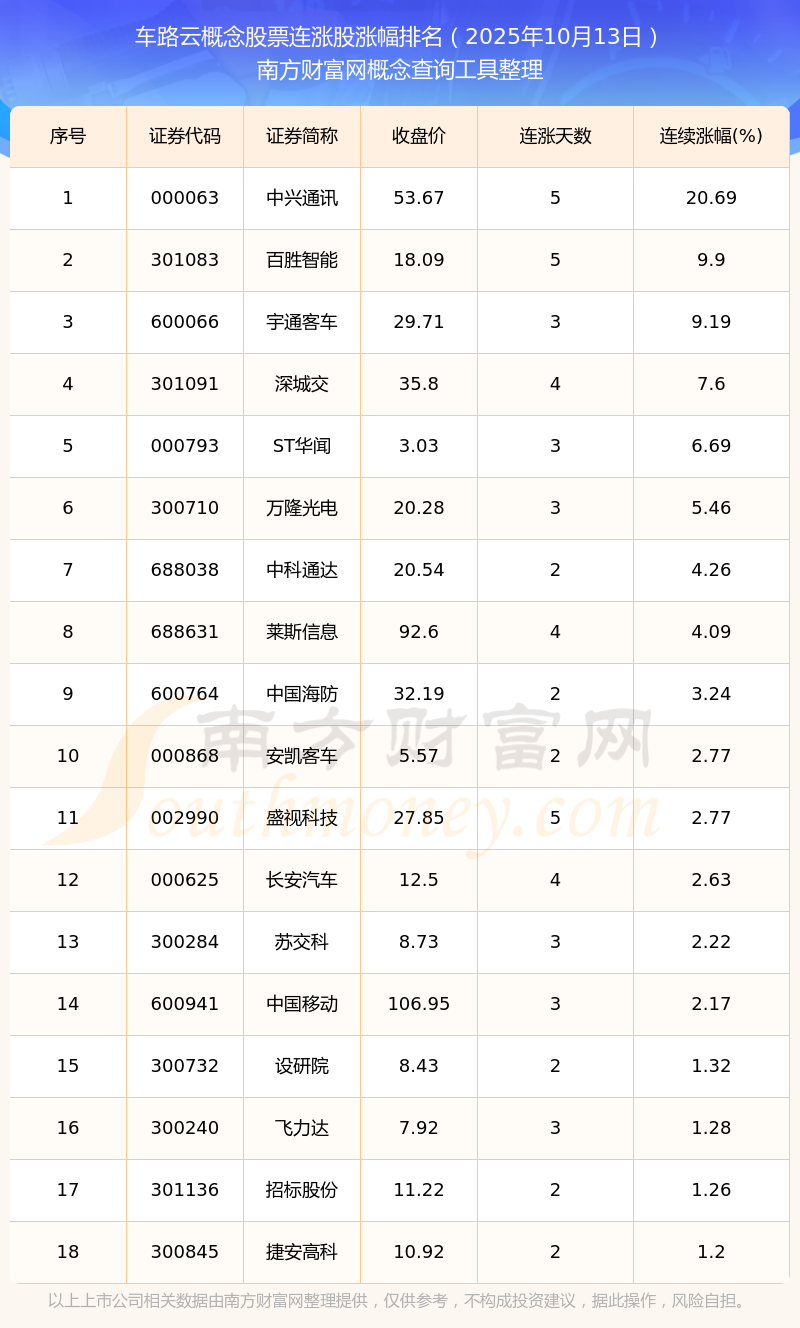根據(jù)南方財富網(wǎng)概念查詢工具數(shù)據(jù)統(tǒng)計,截止2025年10月13日收盤,車路云概念股票共有18只個股實現(xiàn)連漲。其中連續(xù)漲幅較大的個股有中興通訊、百勝智能、宇通客車等,連續(xù)漲幅分別為20.69%、9.90%、9.19%。