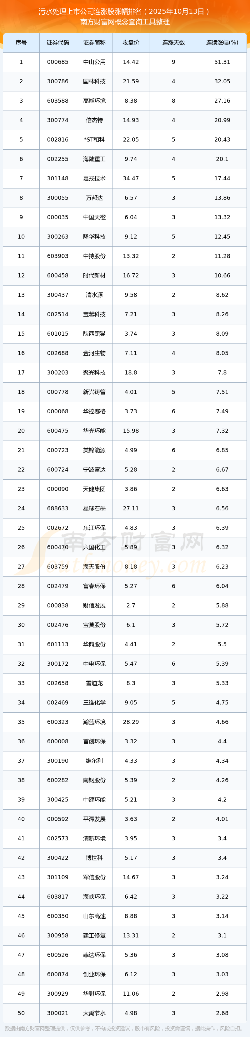 2025年10月13日污水處理上市公司連漲股漲幅排名