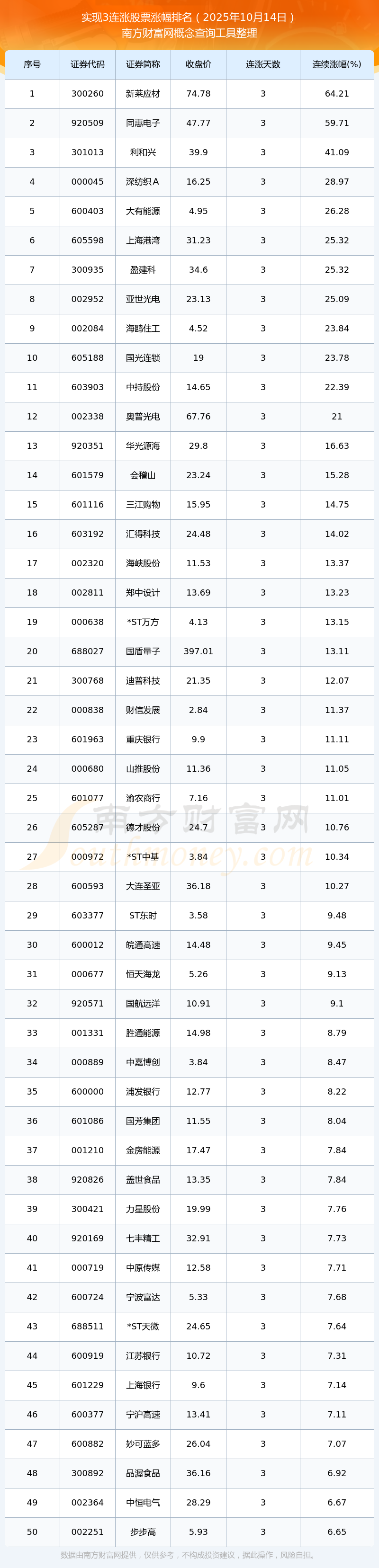 2025年10月14日實現(xiàn)3連漲股票漲幅排名