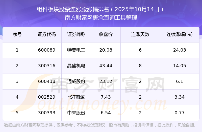 2025年10月14日組件板塊股票連漲股漲幅排名