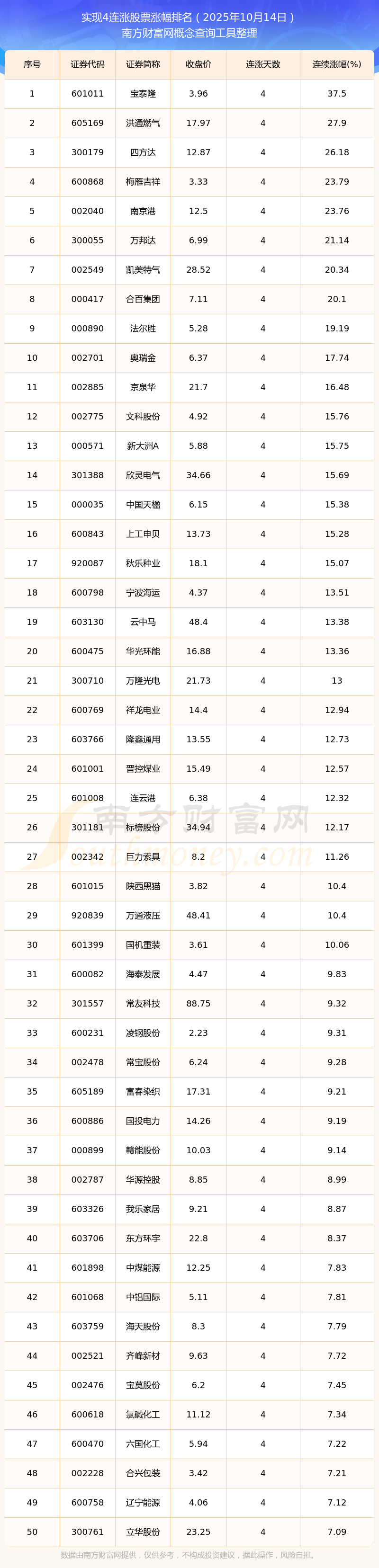 2025年10月14日實(shí)現(xiàn)4連漲股票漲幅排名