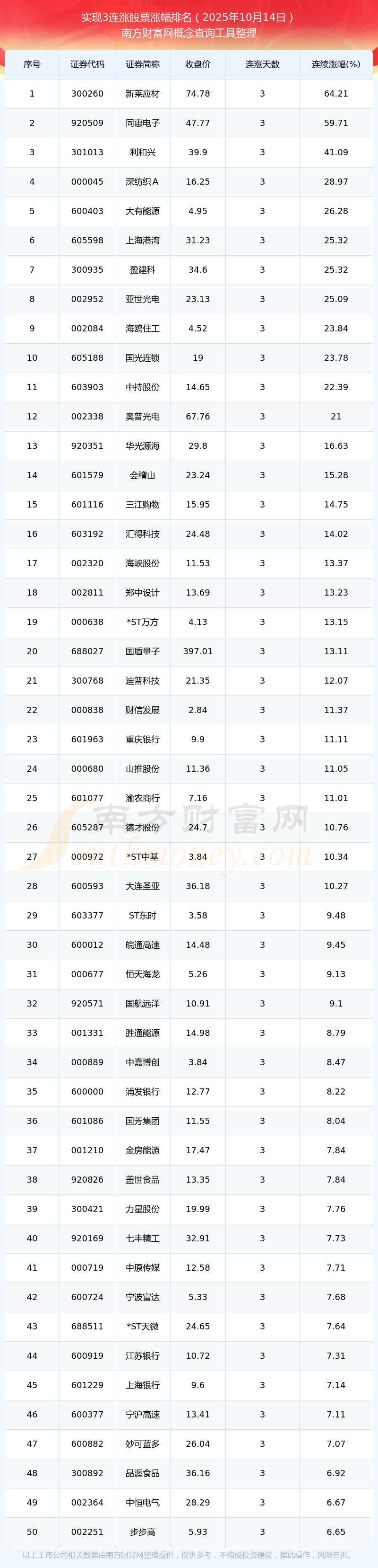 2025年10月14日實(shí)現(xiàn)3連漲股票漲幅排名