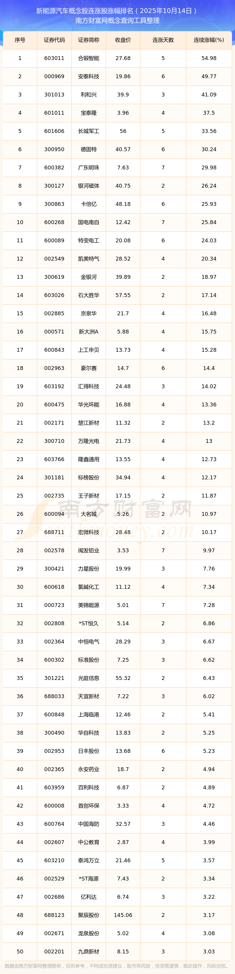 2025年10月14日新能源汽車概念股連漲股漲幅排名