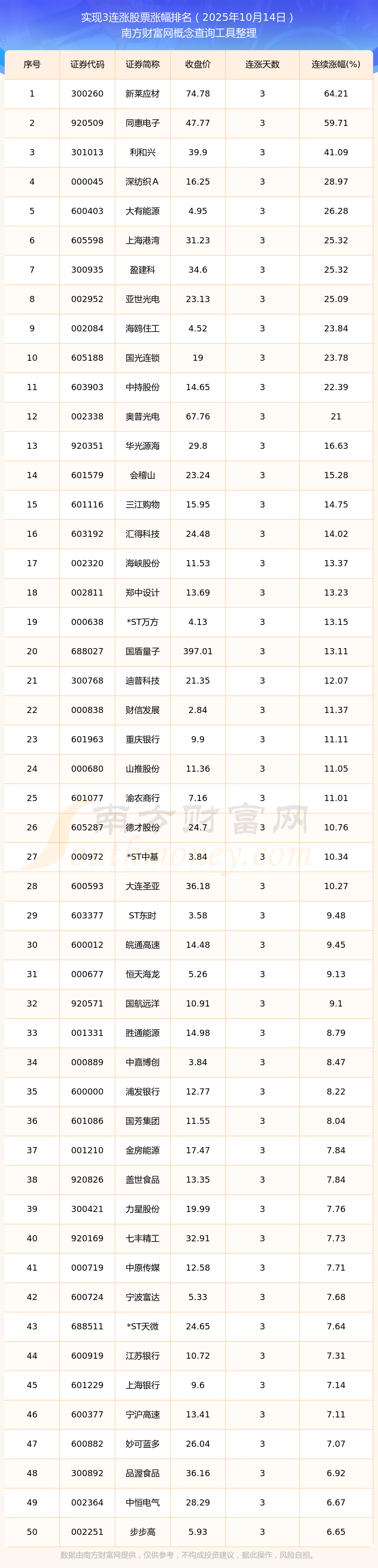 2025年10月14日實現(xiàn)3連漲股票漲幅排名
