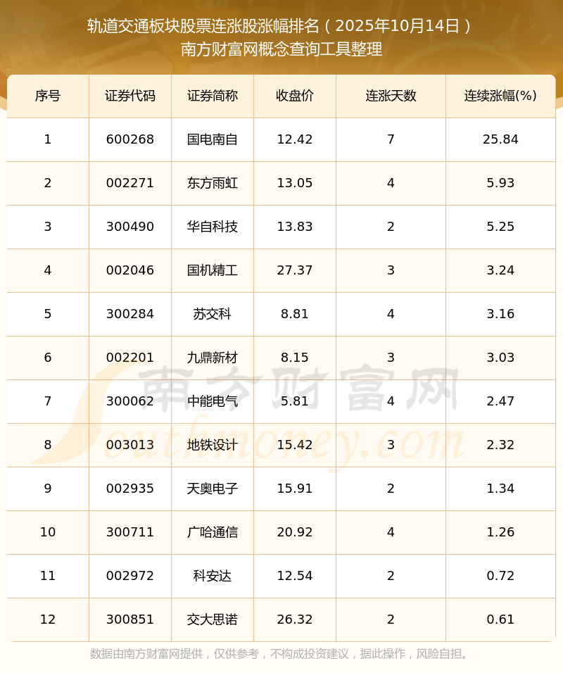 根據(jù)南方財(cái)富網(wǎng)概念查詢工具數(shù)據(jù)統(tǒng)計(jì),截止2025年10月14日收盤,軌道交通板塊股票共有12只個(gè)股實(shí)現(xiàn)連漲。其中連續(xù)漲幅較大的個(gè)股有國(guó)電南自、東方雨虹、華自科技等,連續(xù)漲幅分別為25.84%、5.93%、5.25%。