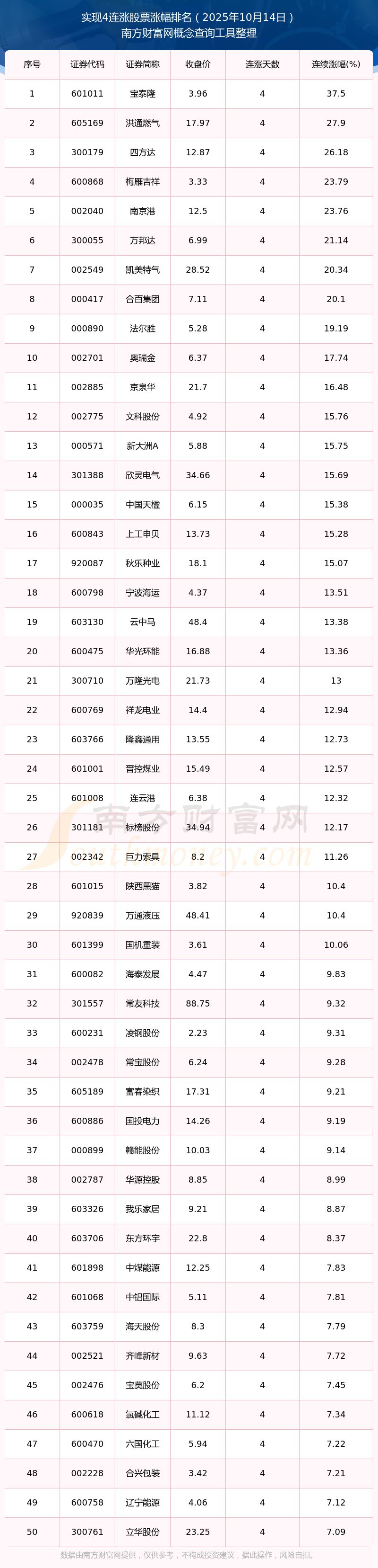2025年10月14日實現(xiàn)4連漲股票漲幅排名