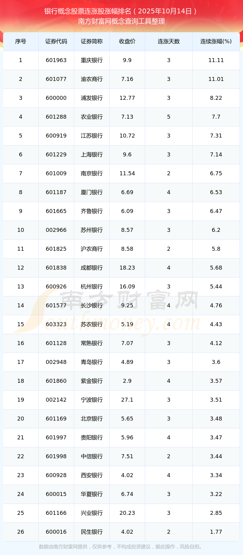 2025年10月14日銀行概念股票連漲股漲幅排名
