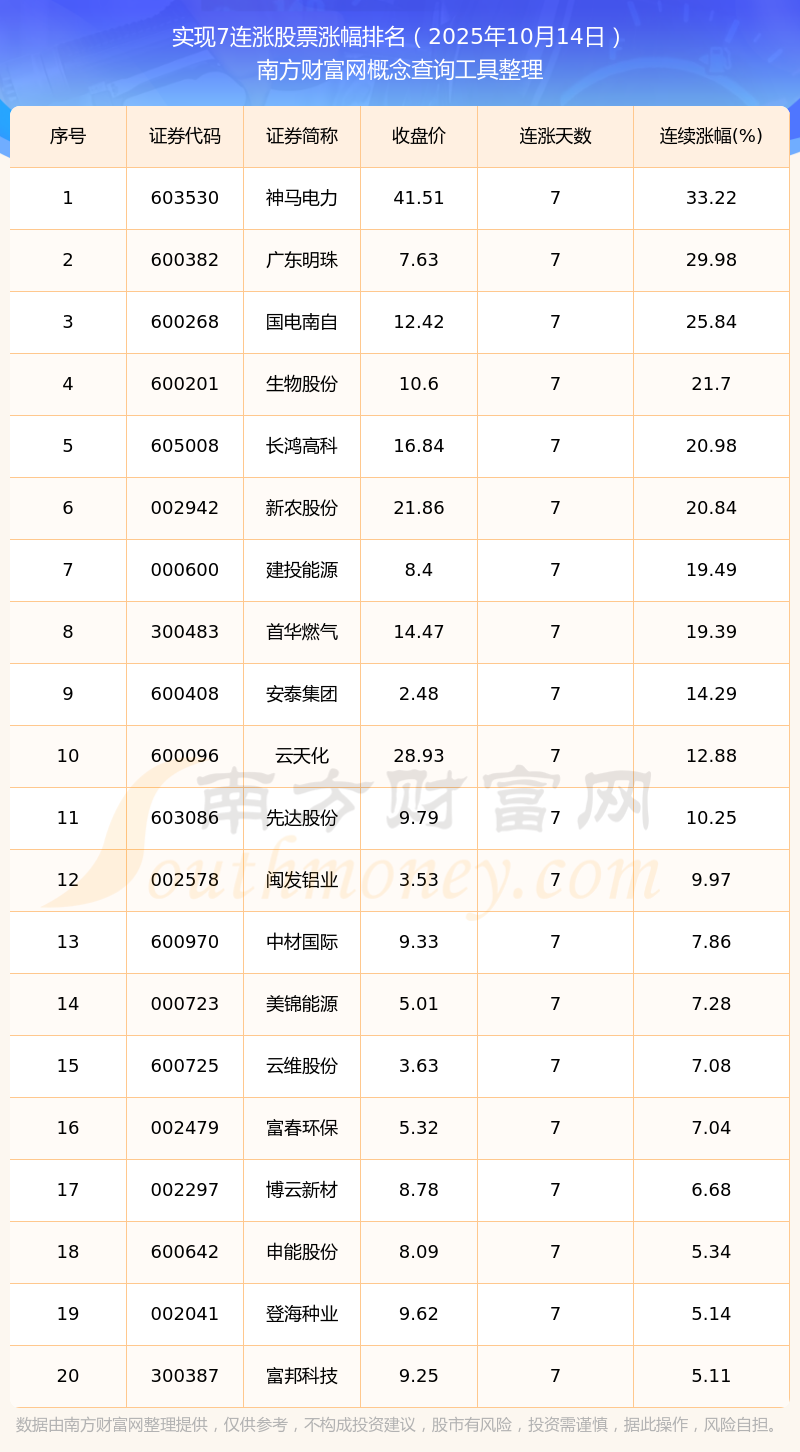 2025年10月14日實(shí)現(xiàn)7連漲股票漲幅排名