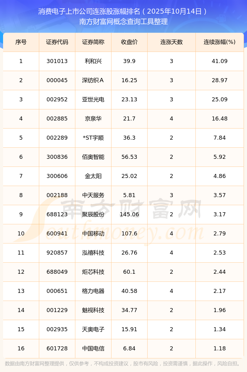 根據(jù)南方財富網(wǎng)概念查詢工具數(shù)據(jù)統(tǒng)計,截止2025年10月14日收盤,消費電子上市公司共有16只個股實現(xiàn)連漲。其中連續(xù)漲幅較大的個股有利和興、深紡織A、亞世光電等,連續(xù)漲幅分別為41.09%、28.97%、25.09%。