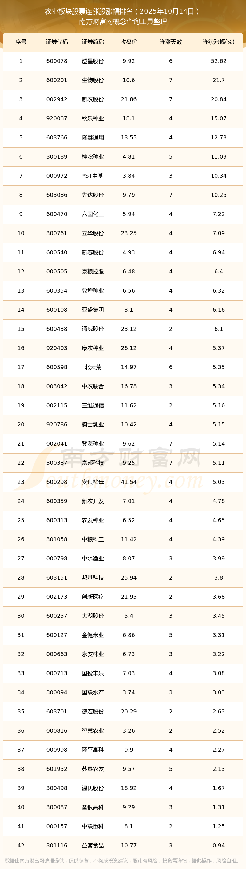 2025年10月14日農(nóng)業(yè)板塊股票連漲股漲幅排名