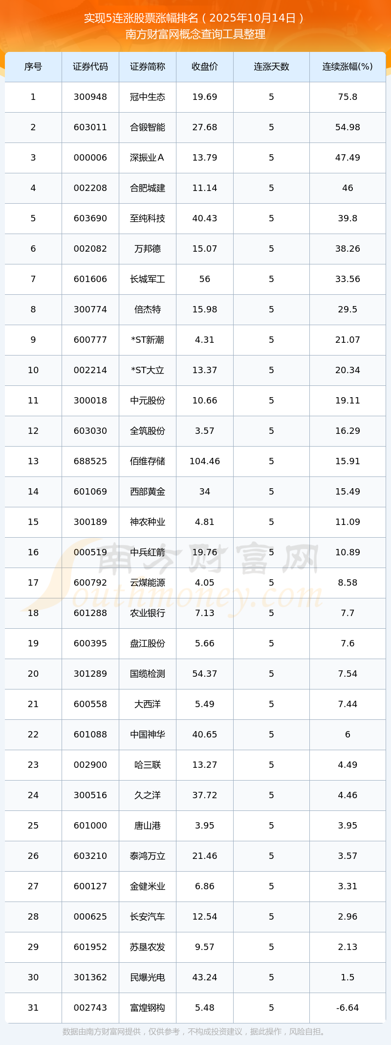 2025年10月14日實(shí)現(xiàn)5連漲股票漲幅排名