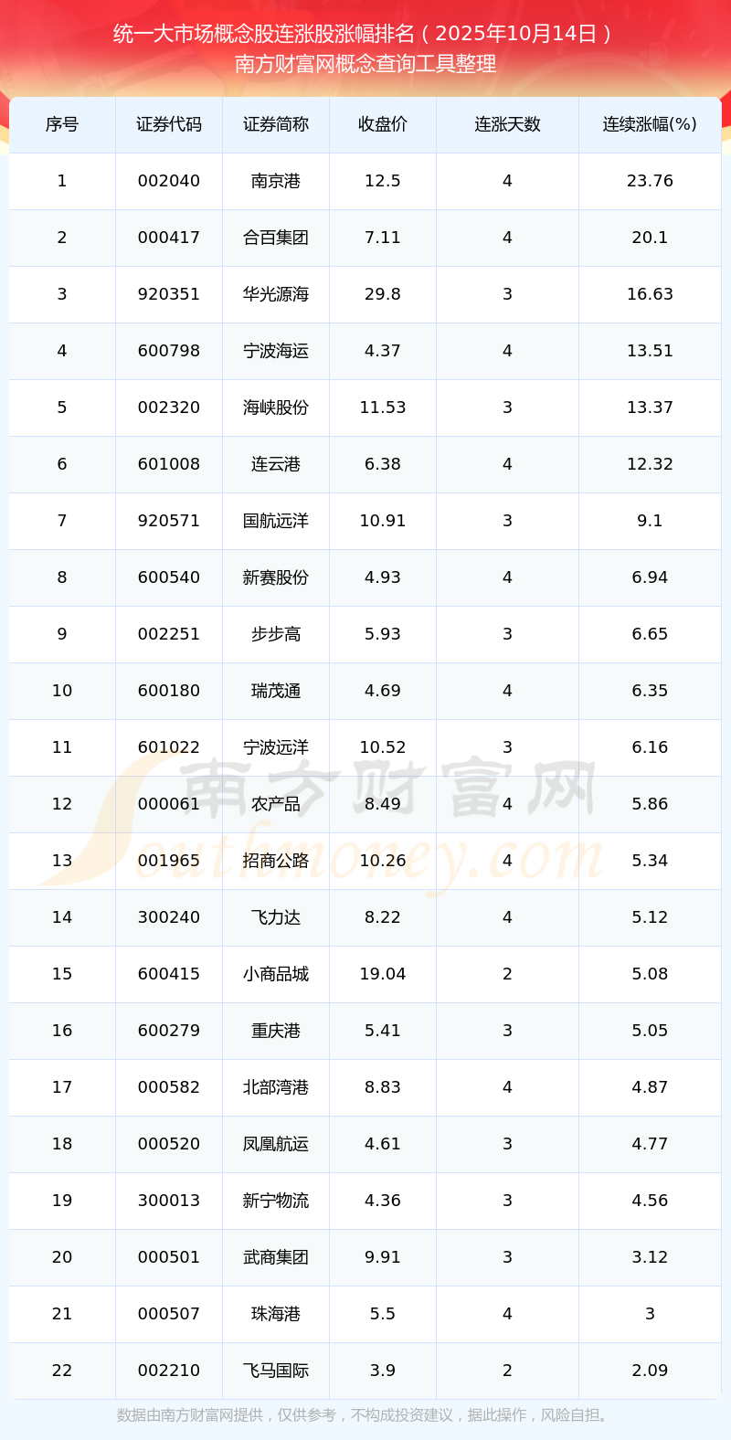 2025年10月14日統(tǒng)一大市場概念股連漲股漲幅排名