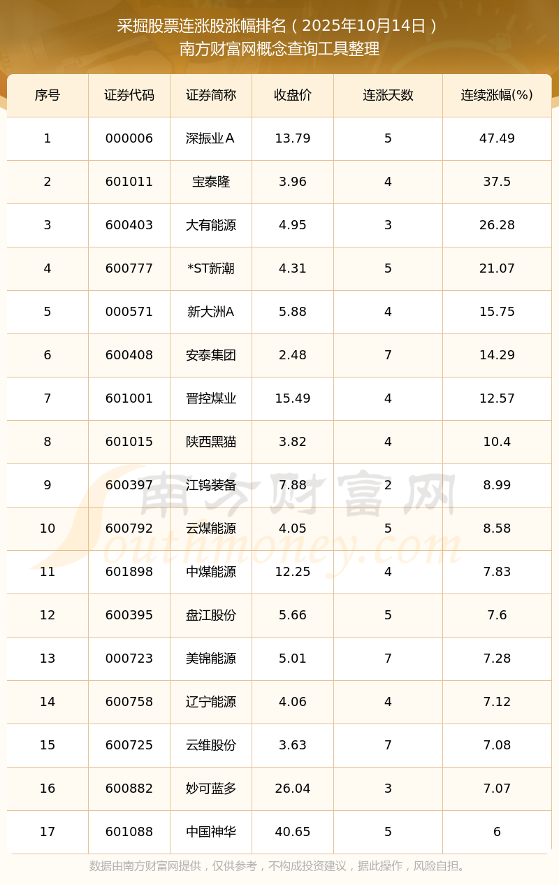 根據(jù)南方財富網(wǎng)概念查詢工具數(shù)據(jù)統(tǒng)計,截止2025年10月14日收盤,采掘股票共有17只個股實現(xiàn)連漲。其中連續(xù)漲幅較大的個股有深振業(yè)A、寶泰隆、大有能源等,連續(xù)漲幅分別為47.49%、37.50%、26.28%。