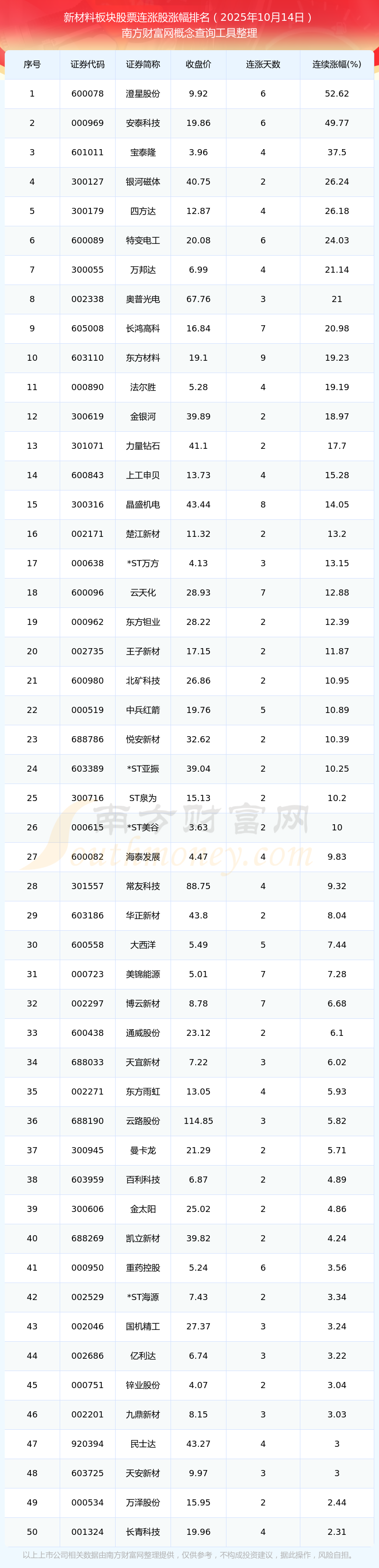 2025年10月14日新材料板塊股票連漲股漲幅排名