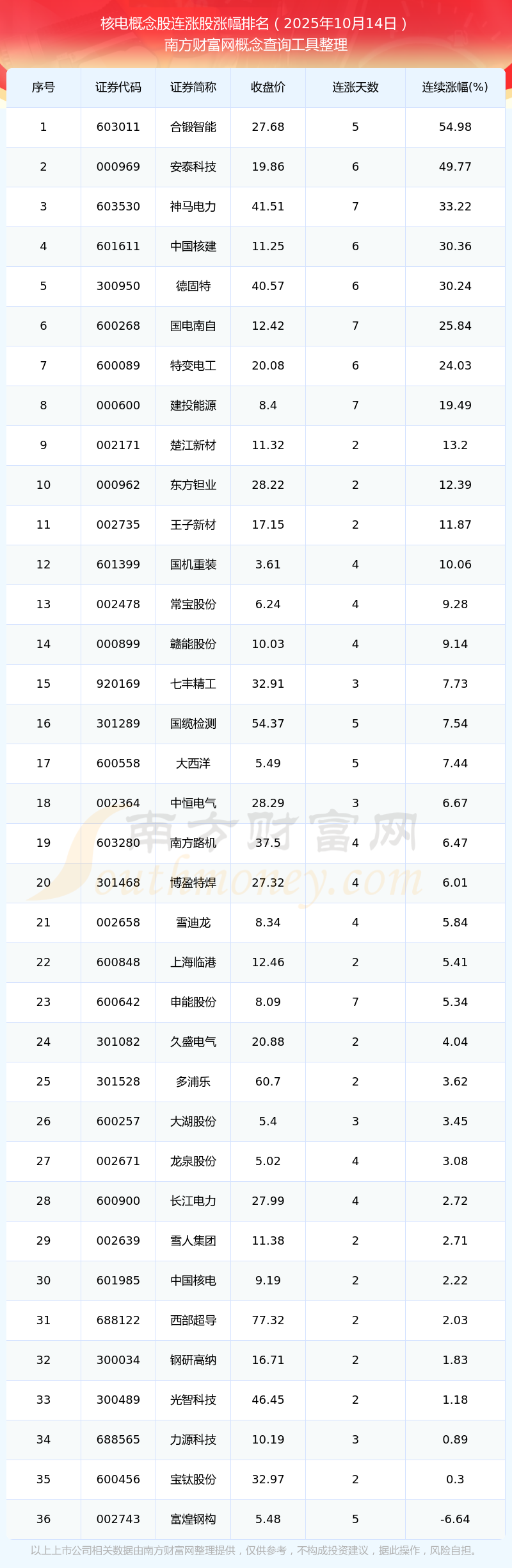 根據(jù)南方財(cái)富網(wǎng)概念查詢工具數(shù)據(jù)統(tǒng)計(jì),截止2025年10月14日收盤,核電概念股共有36只個(gè)股實(shí)現(xiàn)連漲。其中連續(xù)漲幅較大的個(gè)股有合鍛智能、安泰科技、神馬電力等,連續(xù)漲幅分別為54.98%、49.77%、33.22%。