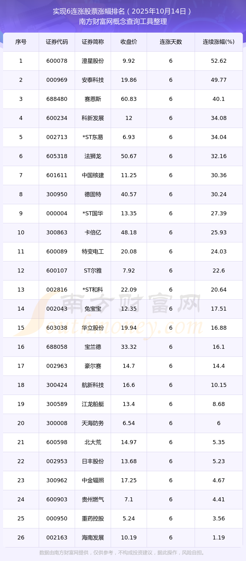 2025年10月14日實(shí)現(xiàn)6連漲股票漲幅排名