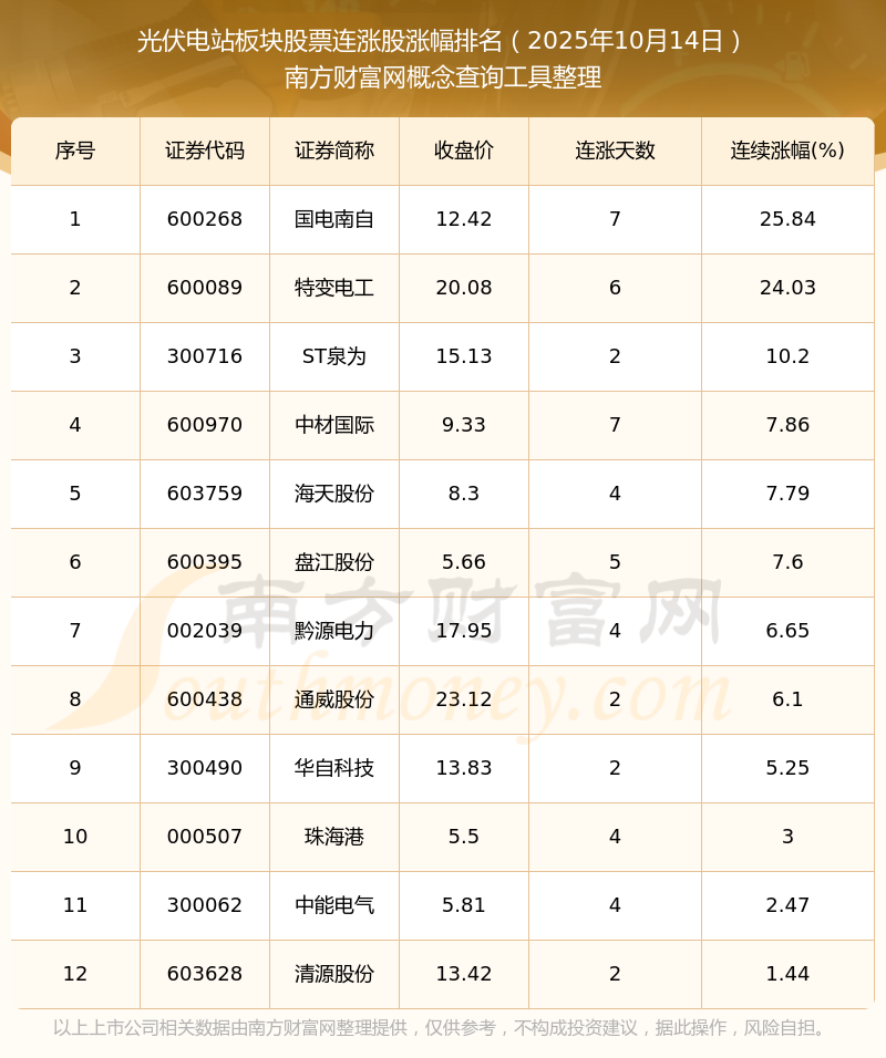 2025年10月14日光伏電站板塊股票連漲股漲幅排名