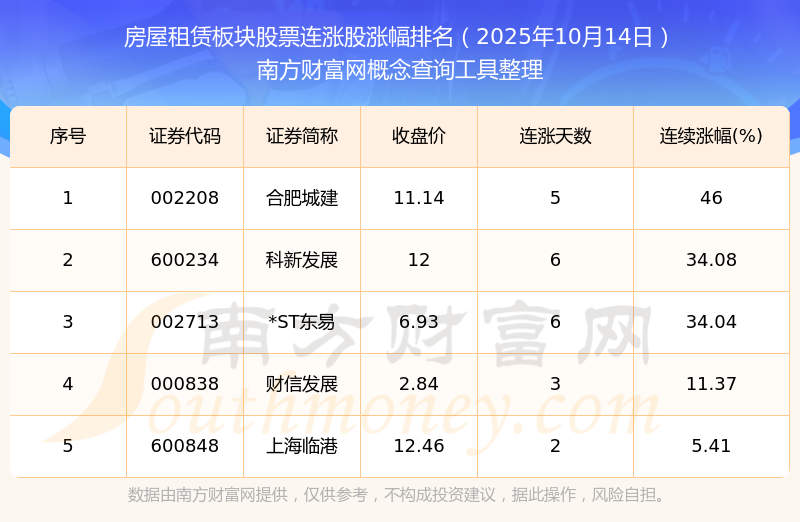 2025年10月14日房屋租賃板塊股票連漲股漲幅排名