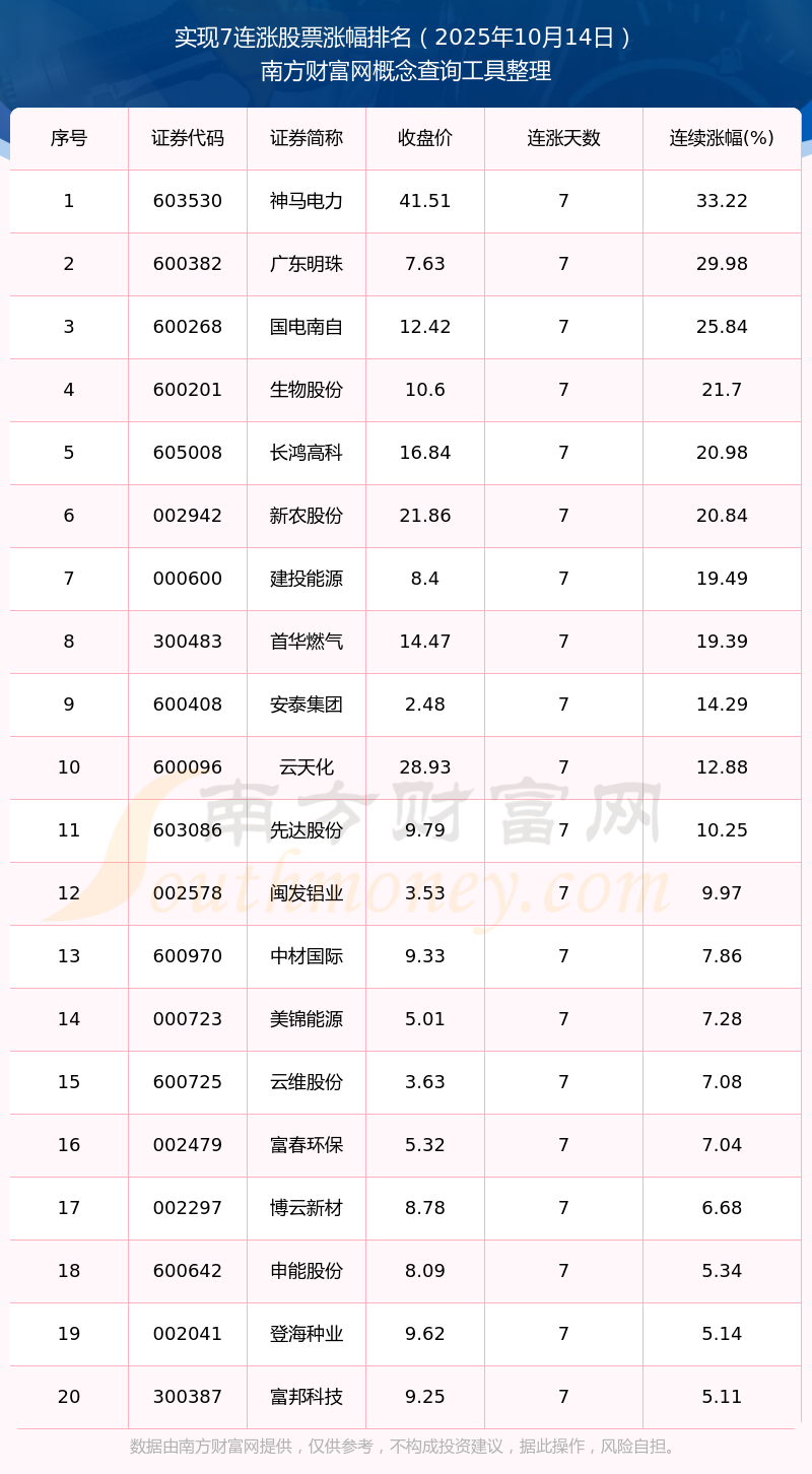 2025年10月14日實(shí)現(xiàn)7連漲股票漲幅排名