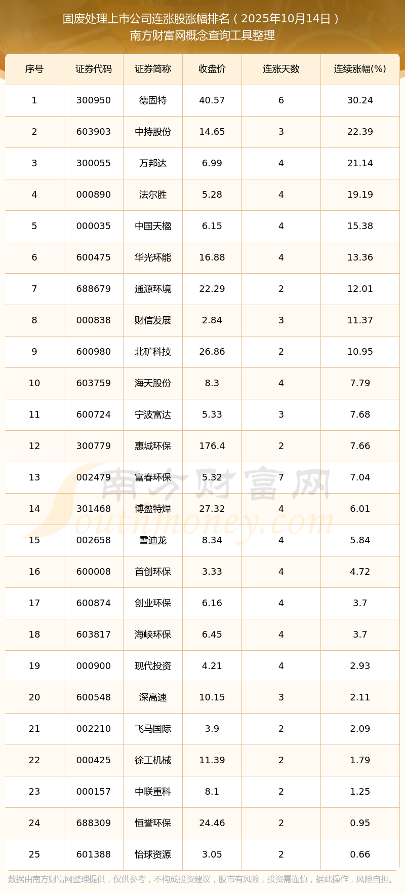 2025年10月14日固廢處理上市公司連漲股票漲幅排名