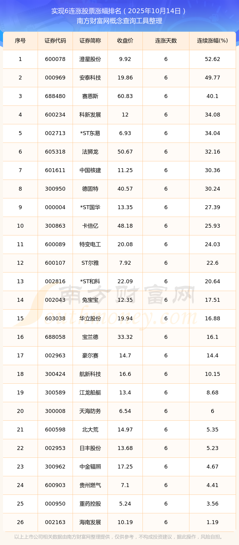 2025年10月14日實現(xiàn)6連漲股票漲幅排名