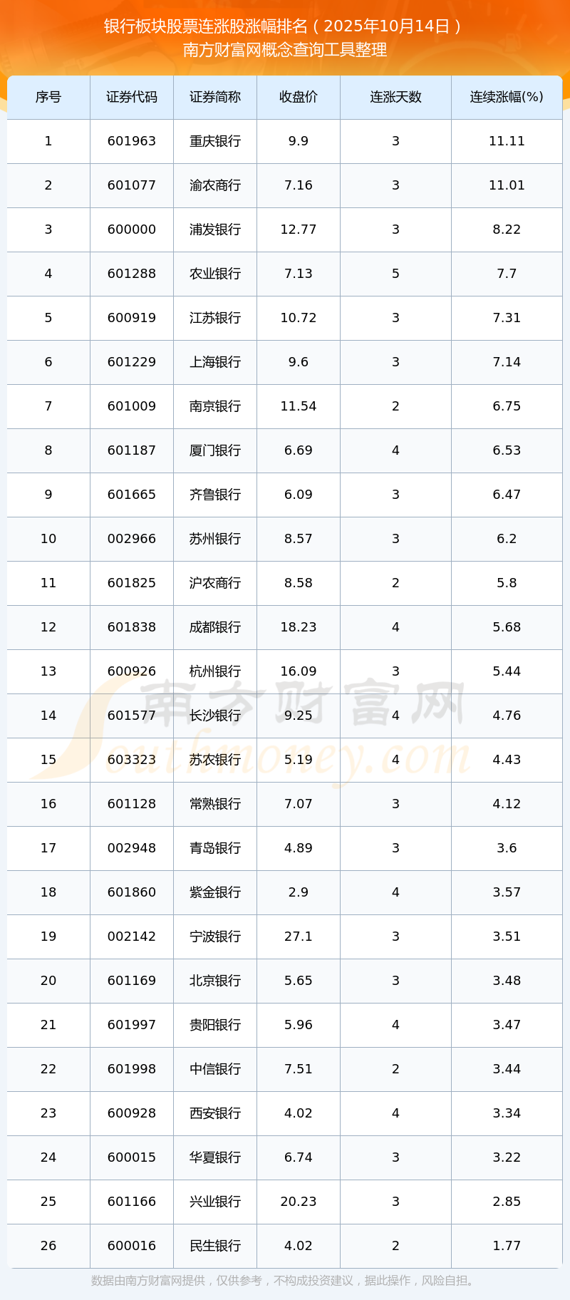 2025年10月14日銀行板塊股票連漲股漲幅排名