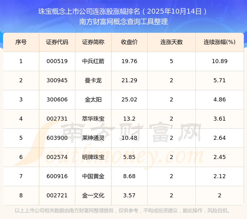 根據(jù)南方財(cái)富網(wǎng)概念查詢工具數(shù)據(jù)統(tǒng)計(jì),截止2025年10月14日收盤,珠寶概念上市公司共有8只個(gè)股實(shí)現(xiàn)連漲。其中連續(xù)漲幅較大的個(gè)股有中兵紅箭、曼卡龍、金太陽等,連續(xù)漲幅分別為10.89%、5.71%、4.86%。