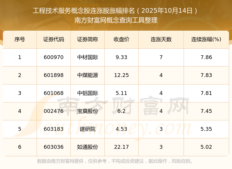 根據(jù)南方財富網(wǎng)概念查詢工具數(shù)據(jù)統(tǒng)計,截止2025年10月14日收盤,工程技術服務概念股共有6只個股實現(xiàn)連漲。其中連續(xù)漲幅較大的個股有中材國際、中煤能源、中鋁國際等,連續(xù)漲幅分別為7.86%、7.83%、7.81%。