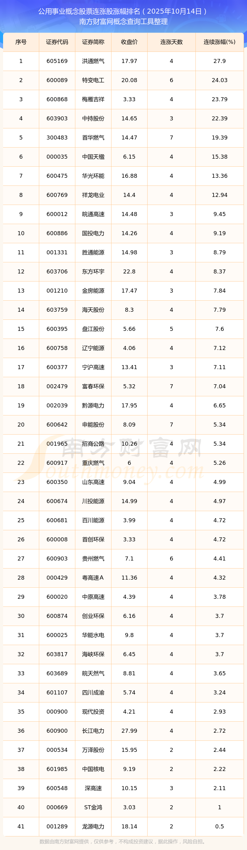 2025年10月14日公用事業(yè)概念股票連漲股漲幅排名