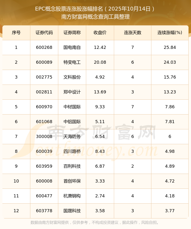 根據南方財富網概念查詢工具數據統(tǒng)計,截止2025年10月14日收盤,EPC概念股票共有12只個股實現連漲。其中連續(xù)漲幅較大的個股有國電南自、特變電工、文科股份等,連續(xù)漲幅分別為25.84%、24.03%、15.76%。