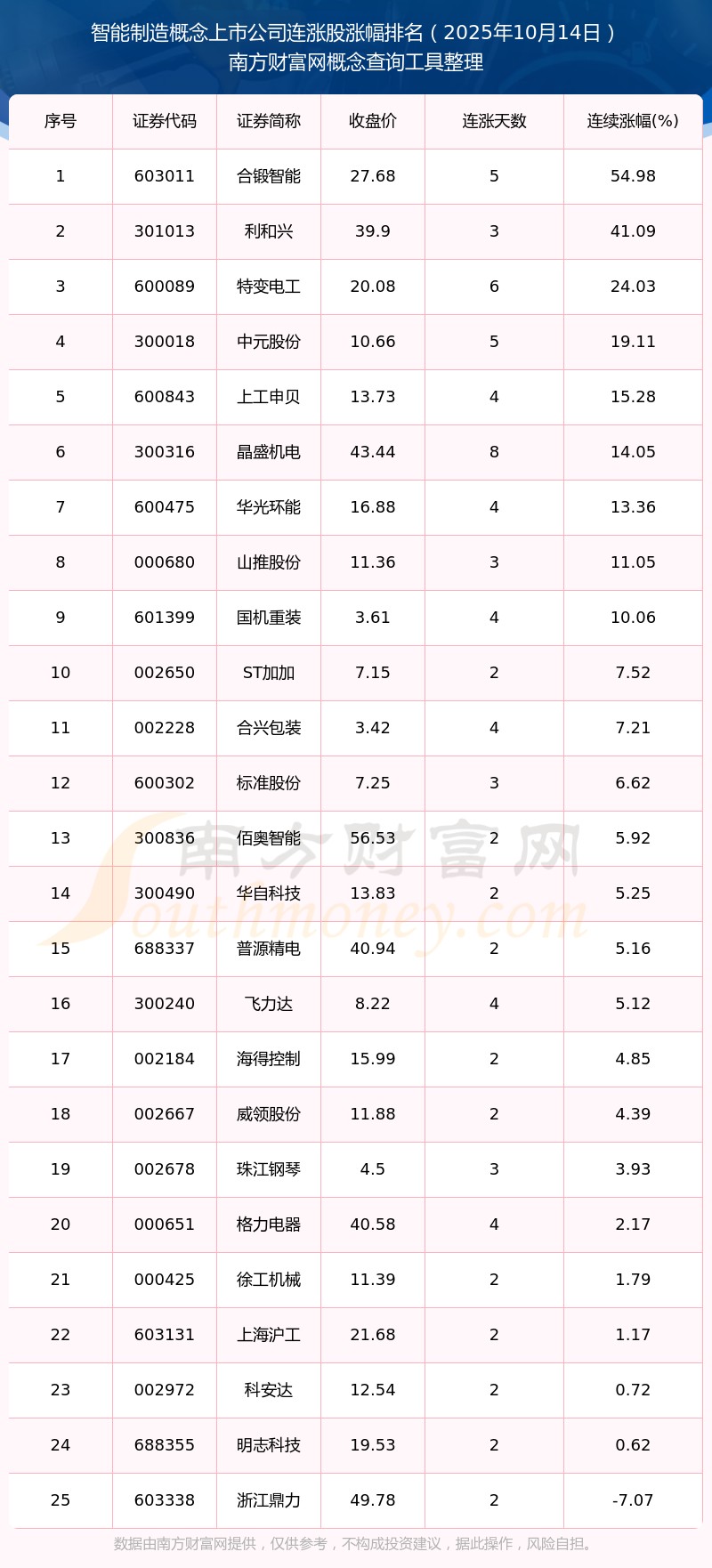 2025年10月14日智能制造概念上市公司連漲股漲幅排名
