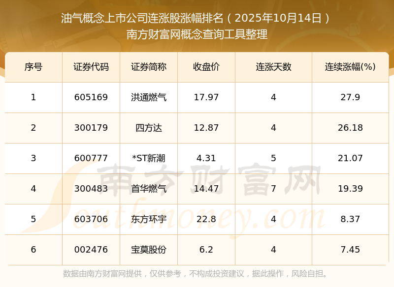 2025年10月14日油氣概念上市公司連漲股漲幅排名