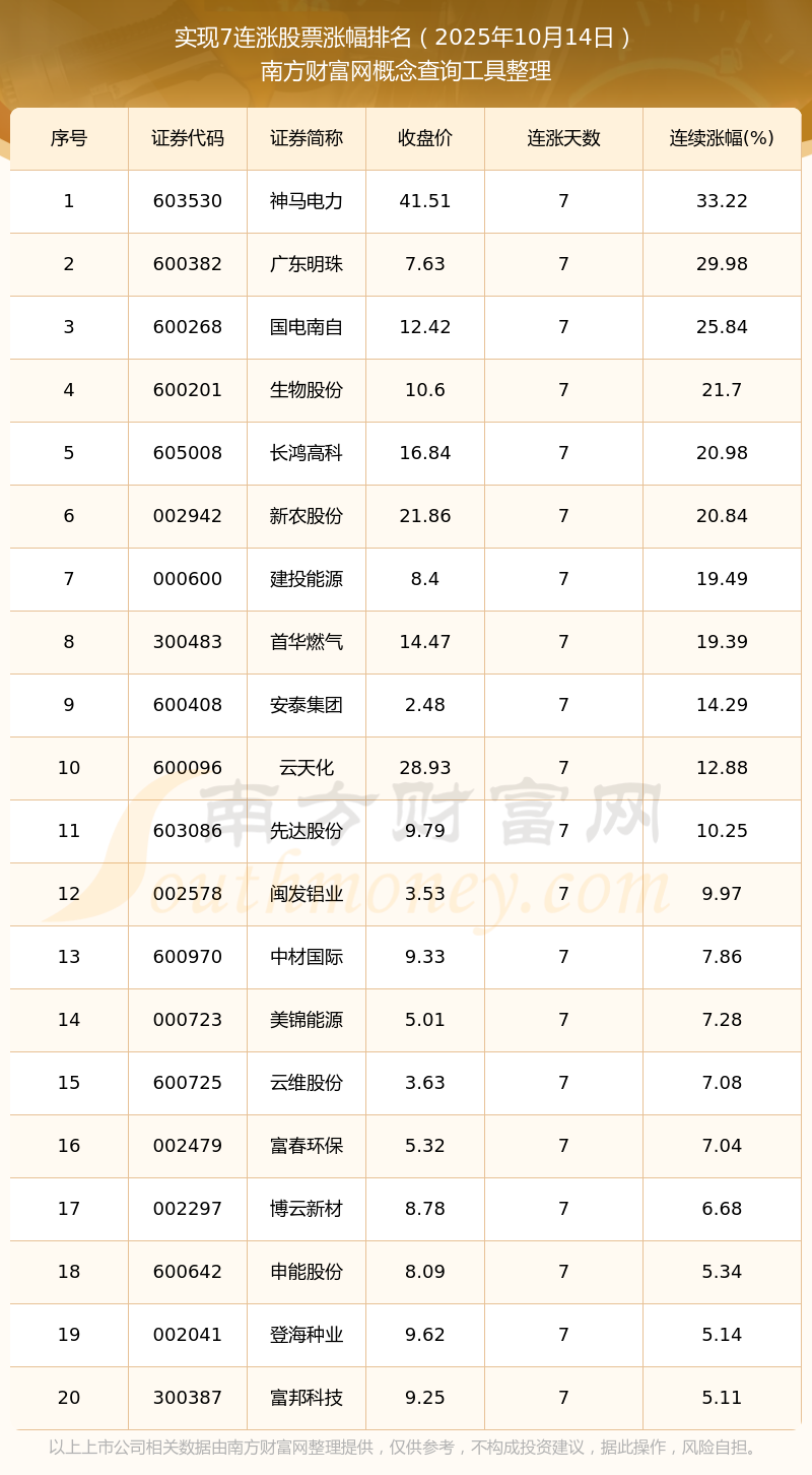 根據(jù)南方財富網(wǎng)概念查詢工具數(shù)據(jù)統(tǒng)計,截止2025年10月14日收盤,共有20只個股實現(xiàn)7天連漲。其中連續(xù)漲幅較大的個股有神馬電力、廣東明珠、國電南自等,連續(xù)漲幅分別為33.22%、29.98%、25.84%。