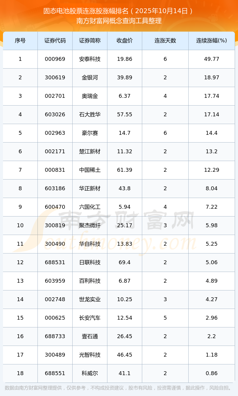 根據(jù)南方財富網(wǎng)概念查詢工具數(shù)據(jù)統(tǒng)計,截止2025年10月14日收盤,固態(tài)電池股票共有18只個股實現(xiàn)連漲。其中連續(xù)漲幅較大的個股有安泰科技、金銀河、奧瑞金等,連續(xù)漲幅分別為49.77%、18.97%、17.74%。