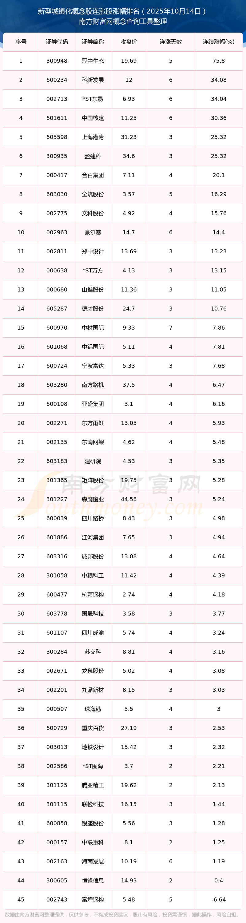 2025年10月14日新型城鎮(zhèn)化概念股連漲股漲幅排名