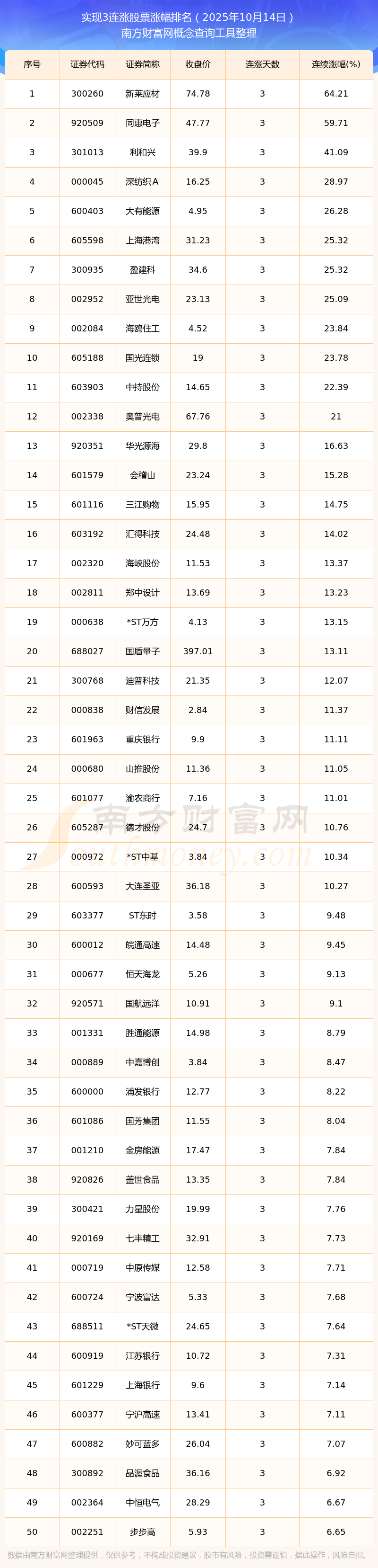 2025年10月14日實現(xiàn)3連漲股票漲幅排名