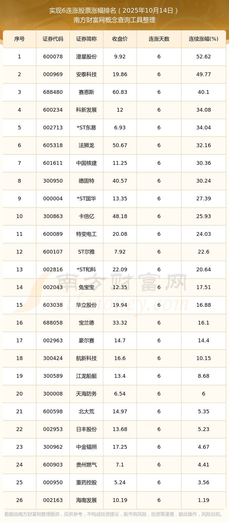 2025年10月14日實(shí)現(xiàn)6連漲股票漲幅排名