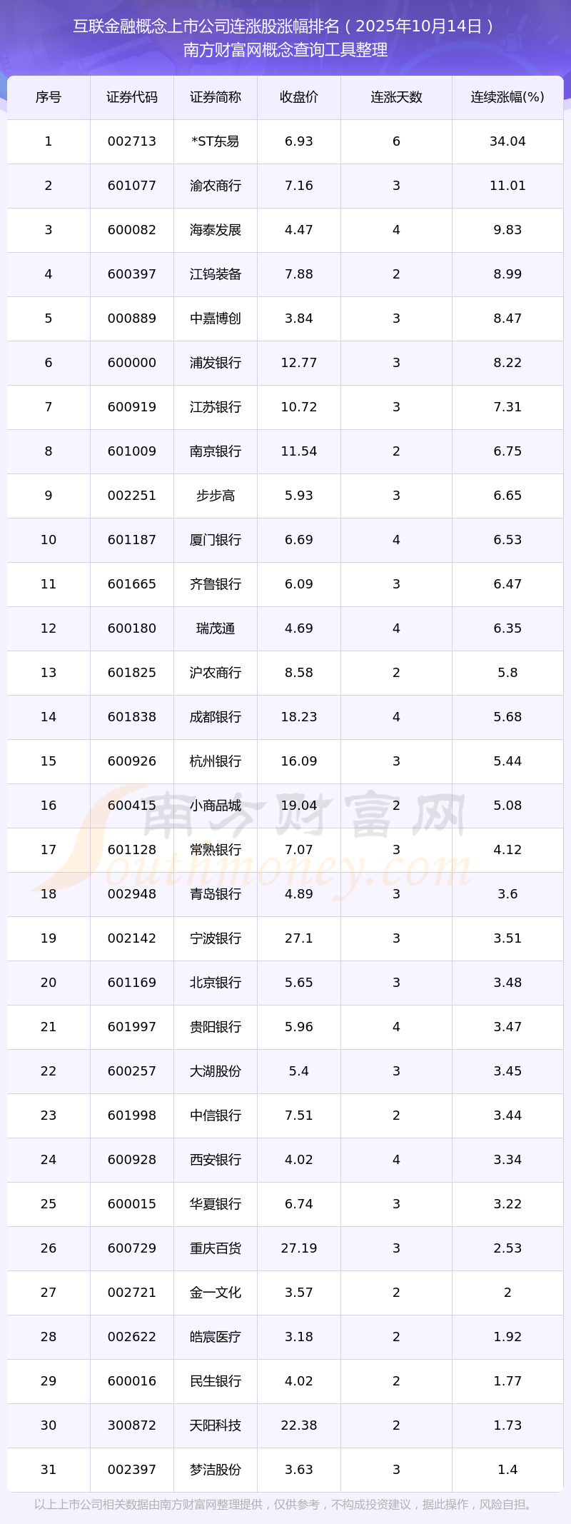 2025年10月14日互聯(lián)金融概念上市公司連漲股漲幅排名