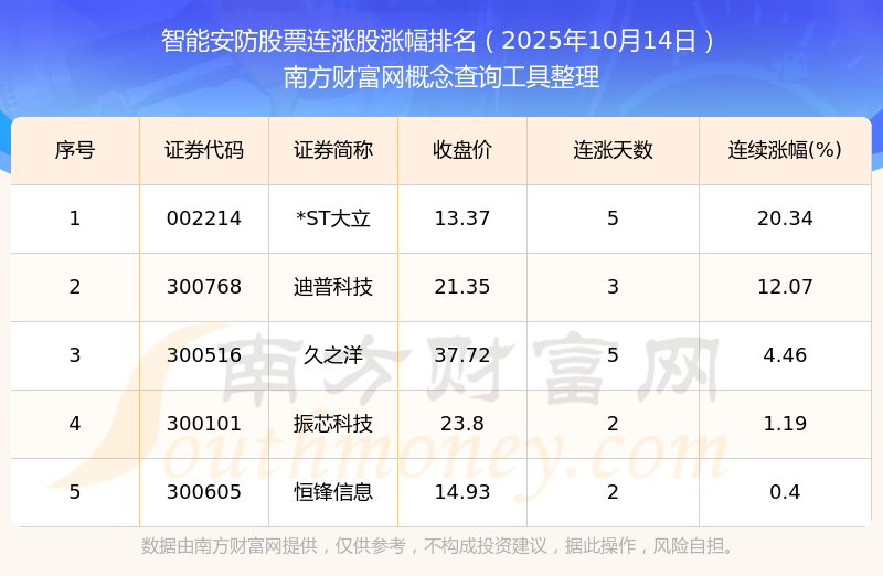 2025年10月14日智能安防股票連漲股漲幅排名