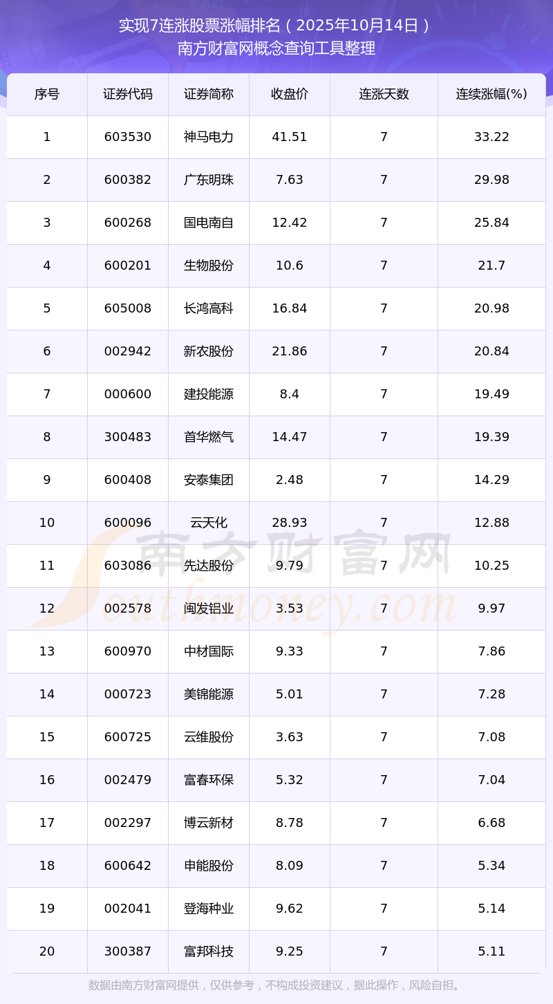 根據(jù)南方財富網(wǎng)概念查詢工具數(shù)據(jù)統(tǒng)計,截止2025年10月14日收盤,共有20只個股實現(xiàn)7天連漲。其中連續(xù)漲幅較大的個股有神馬電力、廣東明珠、國電南自等,連續(xù)漲幅分別為33.22%、29.98%、25.84%。