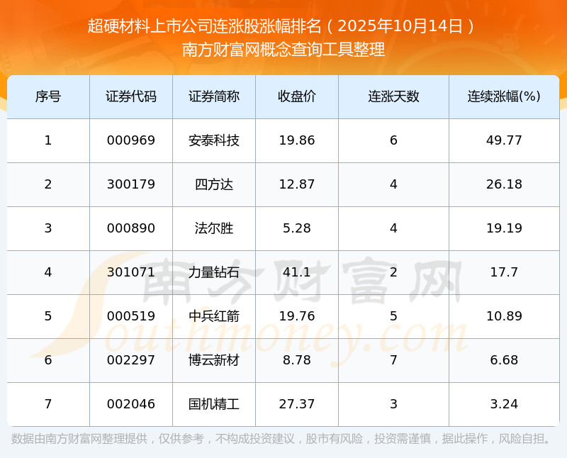 2025年10月14日超硬材料上市公司連漲股票漲幅排名
