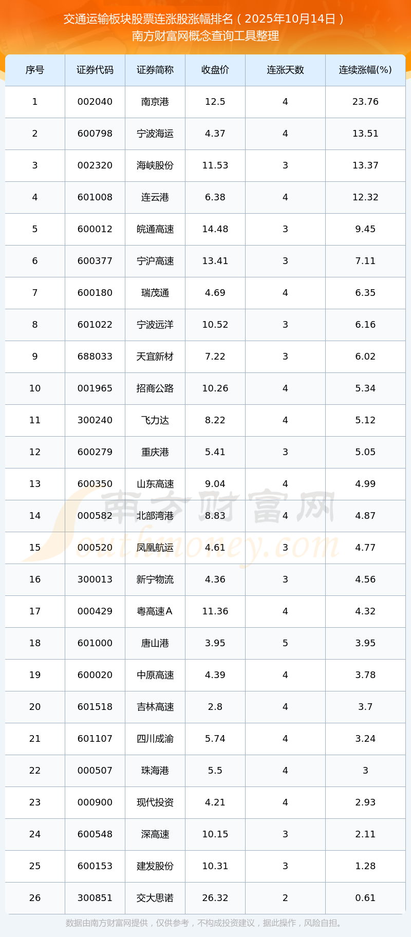 2025年10月14日交通運輸板塊股票連漲股漲幅排名