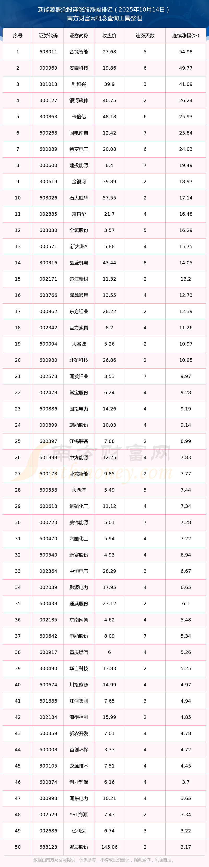 根據(jù)南方財富網概念查詢工具數(shù)據(jù)統(tǒng)計,截止2025年10月14日收盤,新能源概念股共有75只個股實現(xiàn)連漲。其中連續(xù)漲幅較大的個股有合鍛智能、安泰科技、利和興等,連續(xù)漲幅分別為54.98%、49.77%、41.09%。