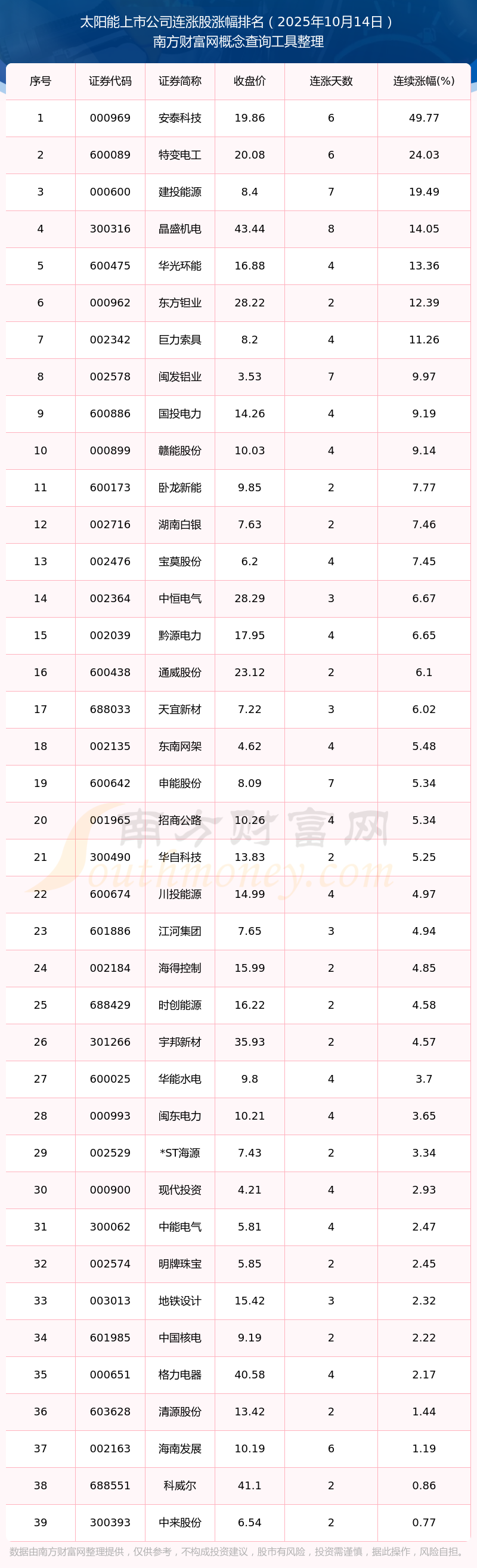 2025年10月14日太陽能上市公司連漲股漲幅排名